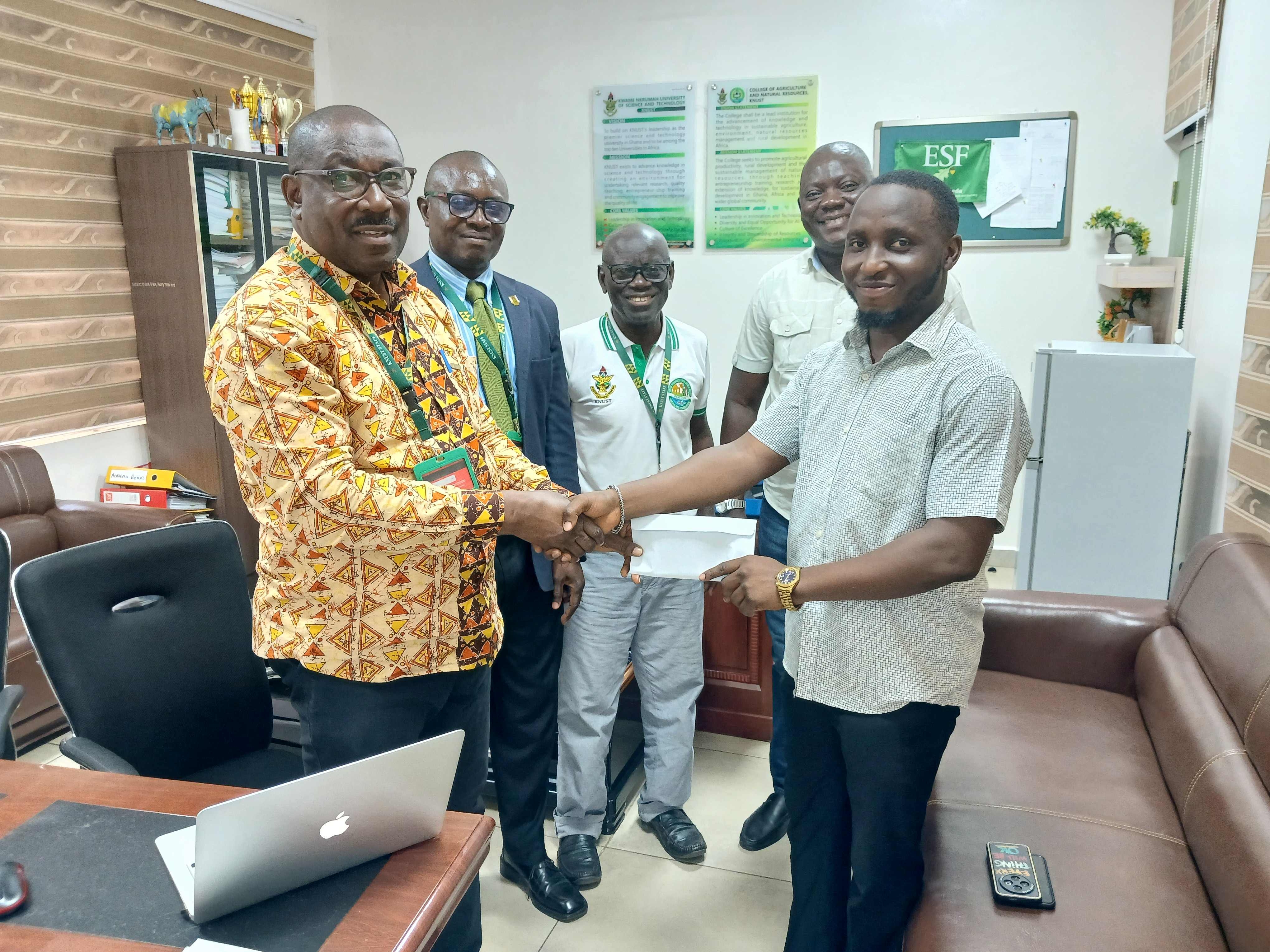 Mr. Frederick Amissah Chief Executive Officer of Universal Hospital Group, has presented a cash award to the 2025 Overall Best Graduating Student of the College of Agriculture and Natural Resources (CANR), Mr. Richard Kitcher in recognition of his outstanding academic performance.